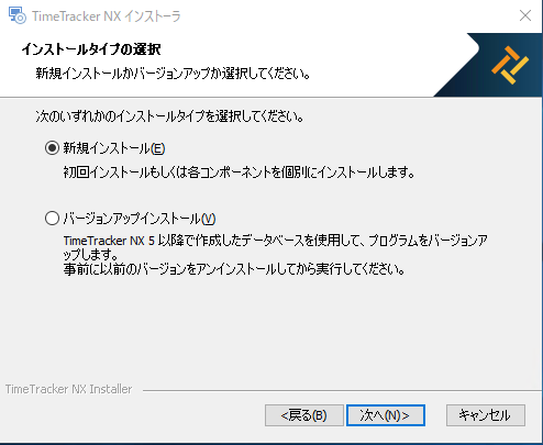 「インストールタイプの選択」の画面で「新規インストール」を選択して、「次へ」をクリックする。