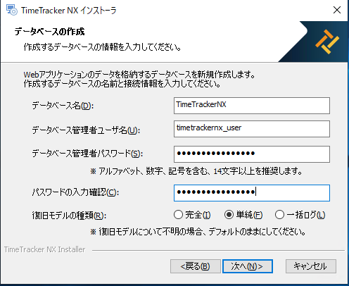 設定項目 内容 データベース名 作成するデータベースの名前 データベース管理者ユーザ名 データベースの管理者権限を持たせるSQL Serverのユーザ名 データベース管理者パスワード 上記ユーザのパスワード ( 「#」以外の文字列) パスワードの入力確認 「データベース管理者パスワード」で入力したパスワードを再入力 復旧モデルの種類 デフォルト(単純)のままにしておきます。 データバース管理者ユーザーについてTimeTracker NX がデータベースにアクセスするときに利用します。