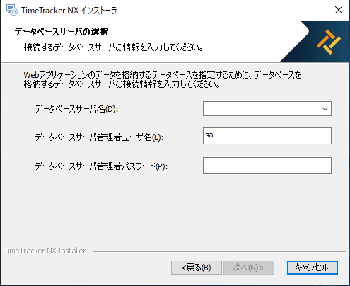 なお、以下のアカウント が作成されている状態になります。アカウント ログイン名 パスワード SQL Server 管理者 sa Administrator/// データベース管理者 timetrackernx_user DbManager/// -